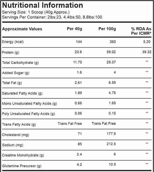 GXN Armour Whey Protein Powder is scientifically designed to deliver 23g of 100% whey protein per 40g of serving. This product contains low fat, sugar, carbohydrates and cholesterol. It contains 4.2 g L-Glutamic Acid, 2.4 g of creatine monohydrate, and 5 g of EAA per serving. It comes in a packing of 2 lbs, 4.4 lbs, and 8.8 lbs, a heavy-duty protein powder by the trusted brand Greenex Nutrition (GXN). This best whey protein in India is cost-effective as compared to whey protein prices in India. Now with this product, one can buy best whey protein online, sitting at your home.
