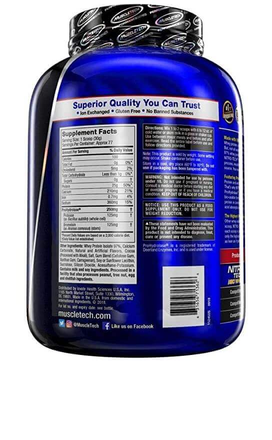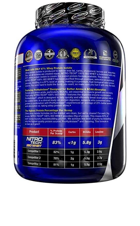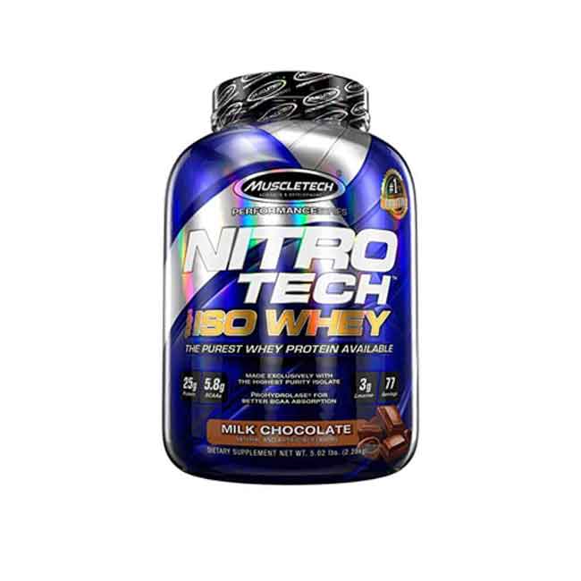 Muscletech Nitro tech 100% iso Whey is the cleanest, purest protein.It uses only 97% isolate as the only protein source. This makes it the cleanest isolate available, to deliver the most protein with the least fat, sugar, carbs, calories and cholesterol possible
