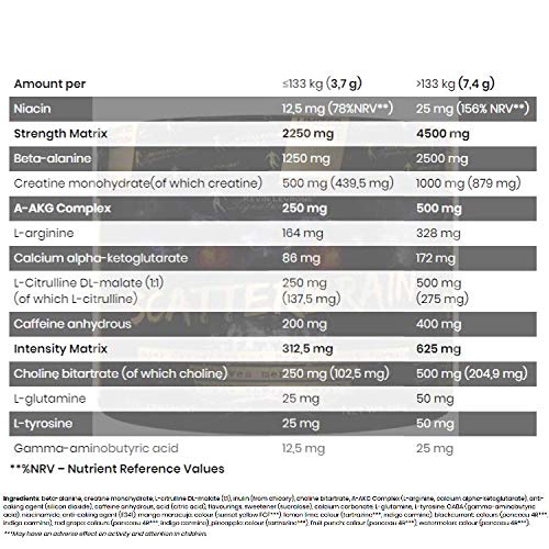 Ingredientscitrulline malate, beta-alanine, creatine monohydrate, L-arginine alpha-ketoglutarate (AKG), anti-caking agent (silicon dioxide), caffeine, rice starch, red beet juice concentrate4, flavoring, sweeteners (sucralose, acesulfame K), color [E160a1,3,5, (E133, E102*)2]. *May have an adverse effect on activity and attention in children.