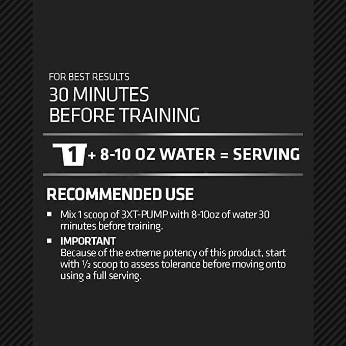 Add and mix 1 scoop of USN 3XT Pump all-in-one pre-workout to 8-10oz of water 30 minutes prior to workout. In order to assess your tolerance to the product, start with a 1/2 scoop, before moving on to a full scoop once tolerance is assessed. Do not take more than one scoop per day.